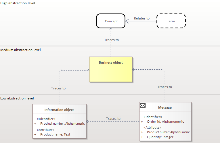 Information architecture aims to capture and break-down information into usable pieces. It often starts with terminology modeling that captures concepts and terms or with business processes that express the need for ”things” in their flows, captured as business objects. These concepts, terms and business objects are broken down into information objects and messages that in turn are related to their origins in order to establish tracebility.