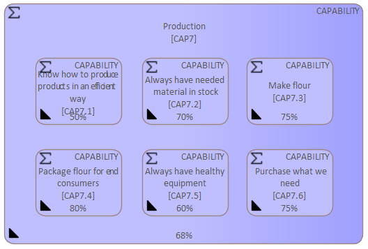 Other parts of the head of the organization are the value streams and capabilities that we need to be good at. Capabilities are visionary formulations that we want to be 100% good at, but in practice always need to improve to get closer to that 100%. Therefore, capabilities are measured in ”health” percentage according to a pre-defined five step model described below.