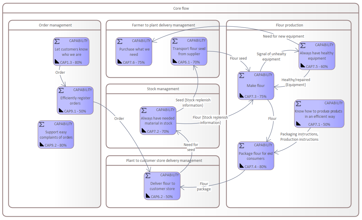 Value streams use capabilities and make them collaborate. The health of the value stream is the average of the health of all needed capabilities. The health of value streams and capabilities indicate where the organization needs to improve and hence creates ”the pull” for change – see layer Implementetion and migration. By working with the health of value streams togheter with their needed capabilities, you get tools for where to focus your enterprise work.